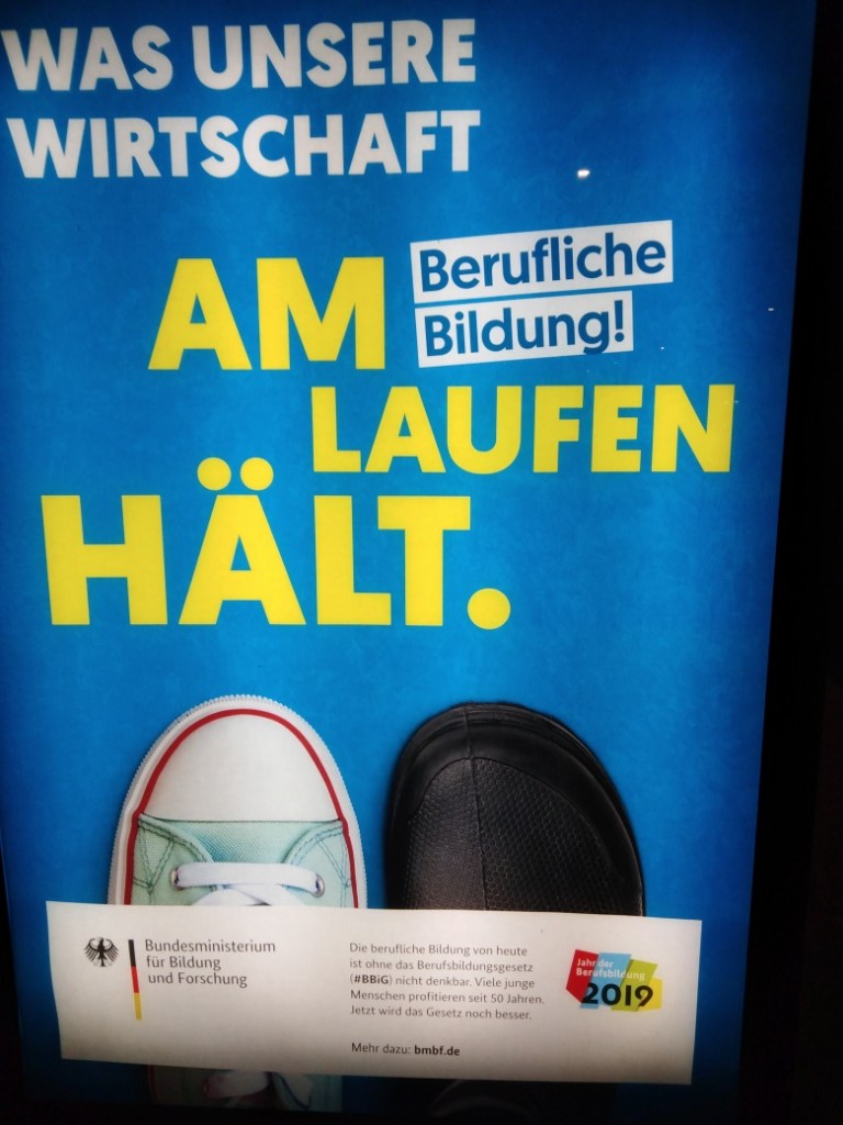 Currently there is a poster campaign , run by the German Federal Ministry for Education and Research, celebrating the 100s anniversary of the Berufsbildungsgesetz – the Vocational Training Act. Fair enough one would say, seeing the main message: