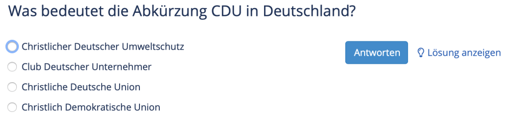 Applying for citizenship/naturalisation in Germany means that the applicant has to undergo a test with a variety of questions. The concern issues of culture, religion, politics and policies, the economy and you name it. One of them asks