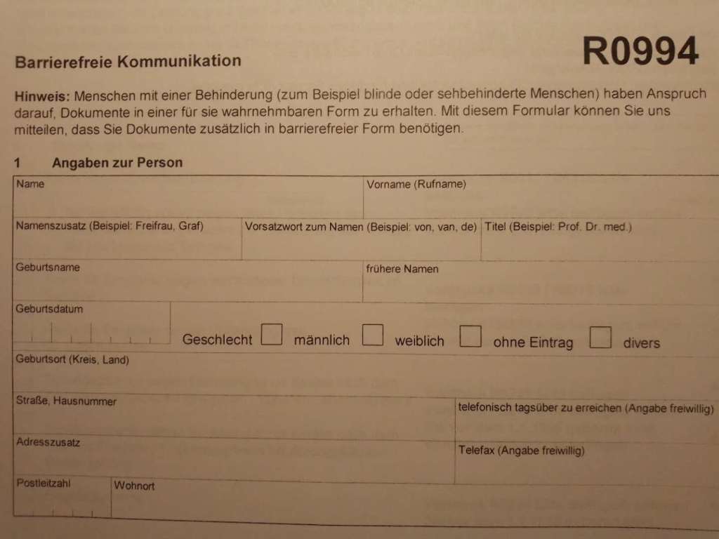 It is a special application, part of a general application. The applicant is asked to complete this form in case s/he needs a barrier-free version, the font-seize surely not allowing access for those who have limited eye-sight.