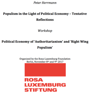 The debate on populism and he New Right surely needs considerations that go beyond political and institionalist considerations, not least looking at the political economy in which it stands and that stands as firm wall behind it. In preparation of a workshop later this year, organised by the Rosa-Luxemburg-Foundation, I developed some reflections which surely need further elaborations but may be already at this stage worthwhile tobe read. The beginning goes like this.