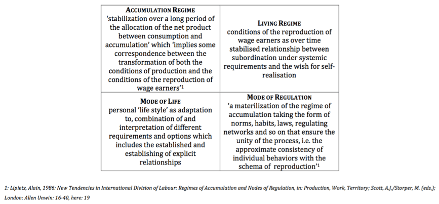 First, Brand starts from the criticism of lifestyle and then sees ,even powerful production structures’. In contrast, in our opinion – strongly influenced by the French Regulation School – a set of four dimensions needs to be considered: [a] the accumulation regime, in a broad way defined as definition of what has value and the appropriate structuration of value; [b] the life-regime as a framework or “set-box” within which individuals can plan their lives – very different ways but in general limited by cornerstones such as paid employment, increasingly private social security [note this oxymoron of the “privacy of the social”] and many more; [c] the mode of regulation, generally not least an ideological and formal system, which ensures the implementation of the two regimes mentioned before. And here, too, there is a counterpart, namely [d] the mode of life – this is looking at what each individual really makes of life – taking into account the small print or observing the principle that terms and conditions apply.