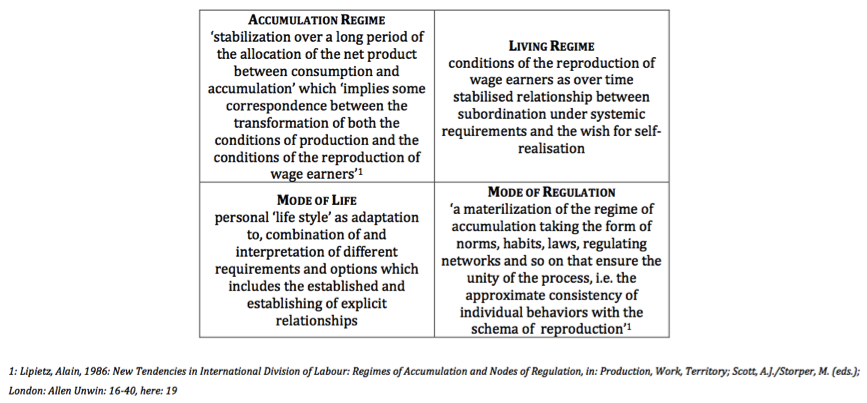 Erstens, Brand geht von der Kritik der Lebensweise aus und sieht dann ‚auch machtvolle Produktionsstrukturen’. Dagegen steht unserer Auffassung – stark geprägt durch die französische Regulationsschule – als Viergespann: [a] entscheidend das Akkumulations-Regime in einem weiten Sinn als System der Definition dessen, was ‚Wert hat’ und die entsprechende Strukturierung der Wertschöpfung; [b] das Lebensregime als Rahmen oder ‚Setzkasten’, innerhalb derer Individuen Lebensentwürfe planen können – sehr verschieden, aber doch begrenzt durch Eckpfeiler wie etwa Erwerbsarbeitsverpflichtung, zunehmend private soziale Sicherung [man beachte dieses Oxymoron der Privatheit des Sozialen] u.v.m.; [c] die Regulierungsweise, allgemein als nicht zuletzt ideologisches und formales System, welches die Umsetzung der beiden genannten Regime sicherstellt. Und auch hier gibt es ein Pendant, namentlich [d] die Lebensweise – hier geht es darum, was denn jeder Einzelne wirklich aus dem Leben macht – unter Berücksichtigung des Kleingedruckten oder bei Beachtung des Grundsatzes ‚Es gelten die allgemeinen Geschäftsbedingungen’.